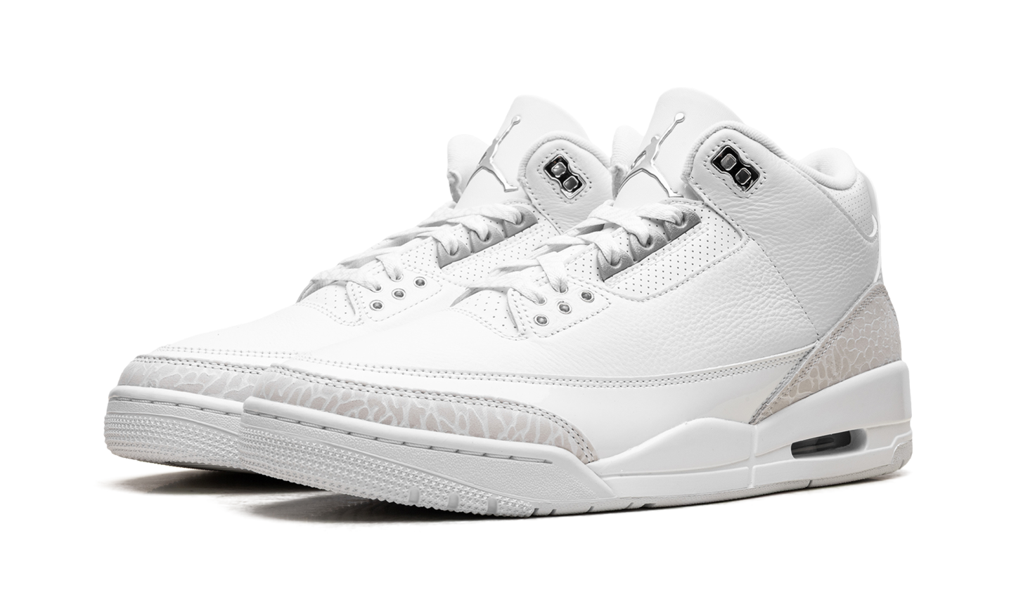 Elevate your look with the pristine style of the Air Jordan 3 "Pure Money." The all-white leather upper, complemented by subtle metallic silver accents on the eyelets and branding, offers a clean and luxurious aesthetic. The iconic elephant print adds a touch of texture, making this versatile sneaker a fresh statement piece.