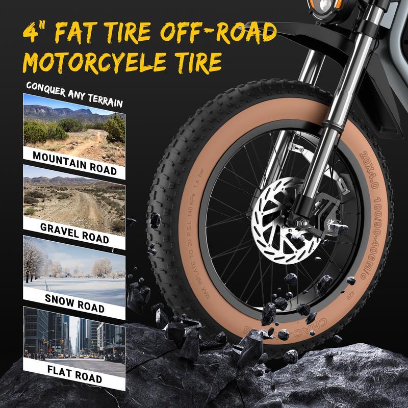 Equipped with full suspension, including an upside-down front fork and rear oil-spring shock absorbers, the M5 glides over bumps with ease. The 20x4.0 fat tires enhance grip and stability, ensuring a confident ride on paved roads and light trails. - 【Built for Style & Strength】