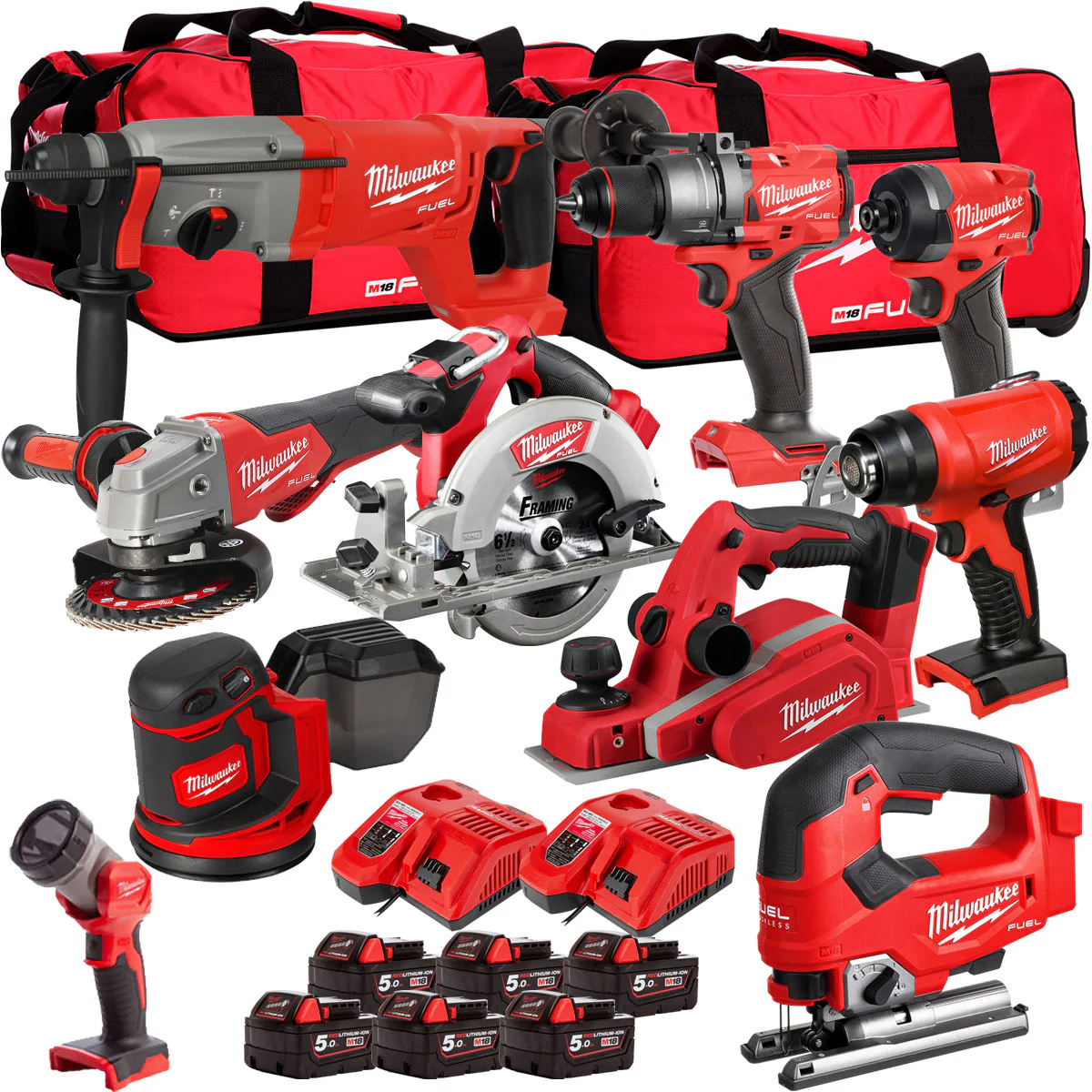Milwaukee 18V Cordless 10 Piece Tool Kit with 6 x 5.0Ah Batteries & Charger in Bag T4TKIT-507