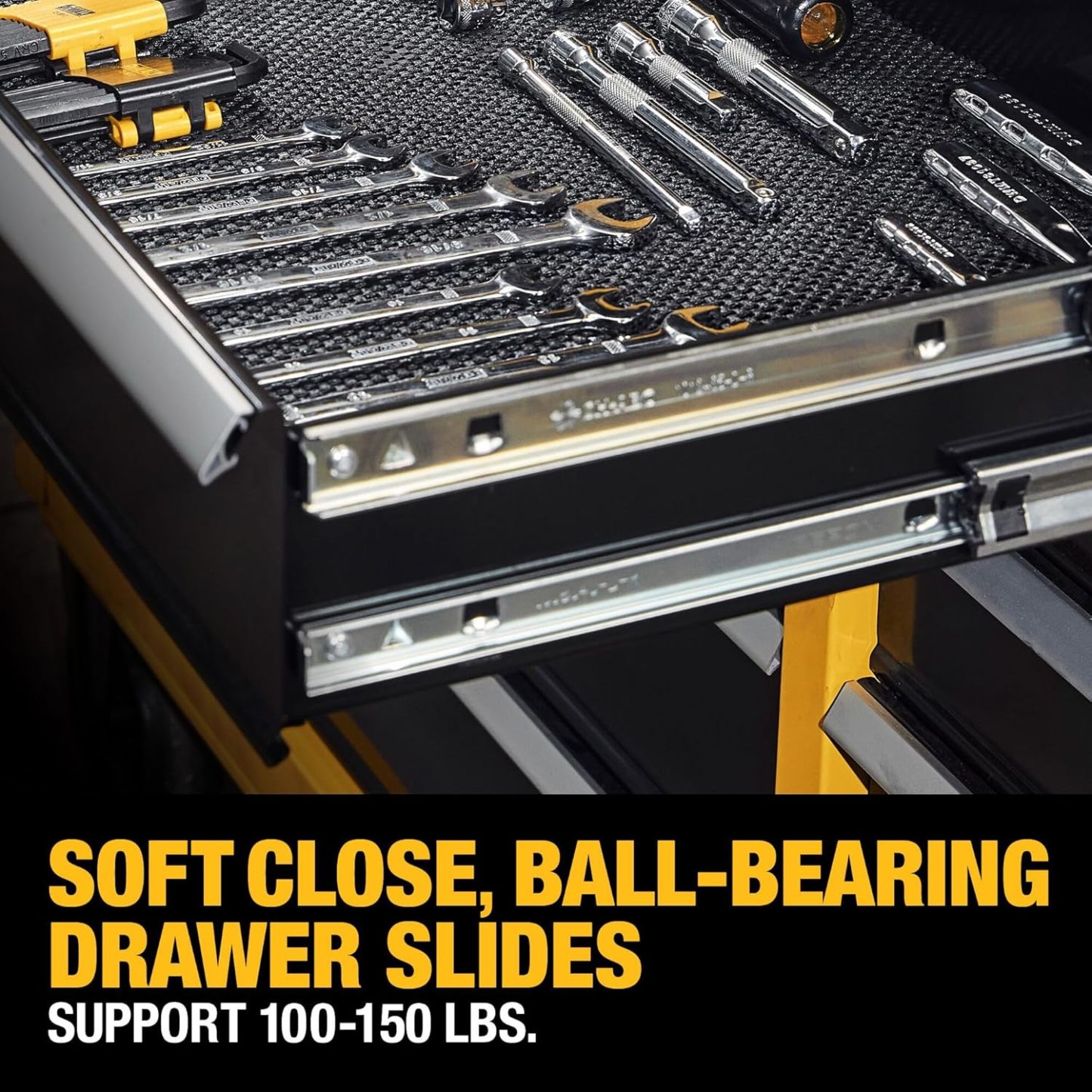 - Pre-cut DEWALT embossed top mat and drawer liners help protect tools
