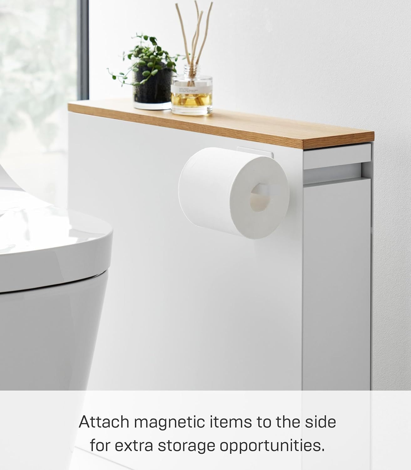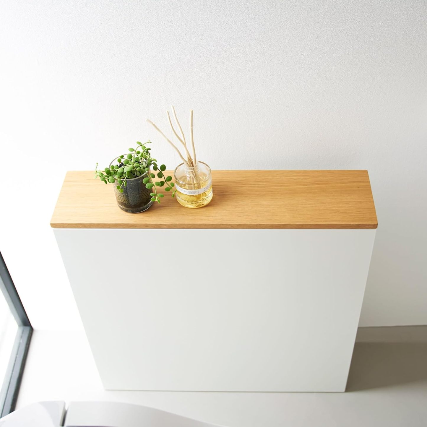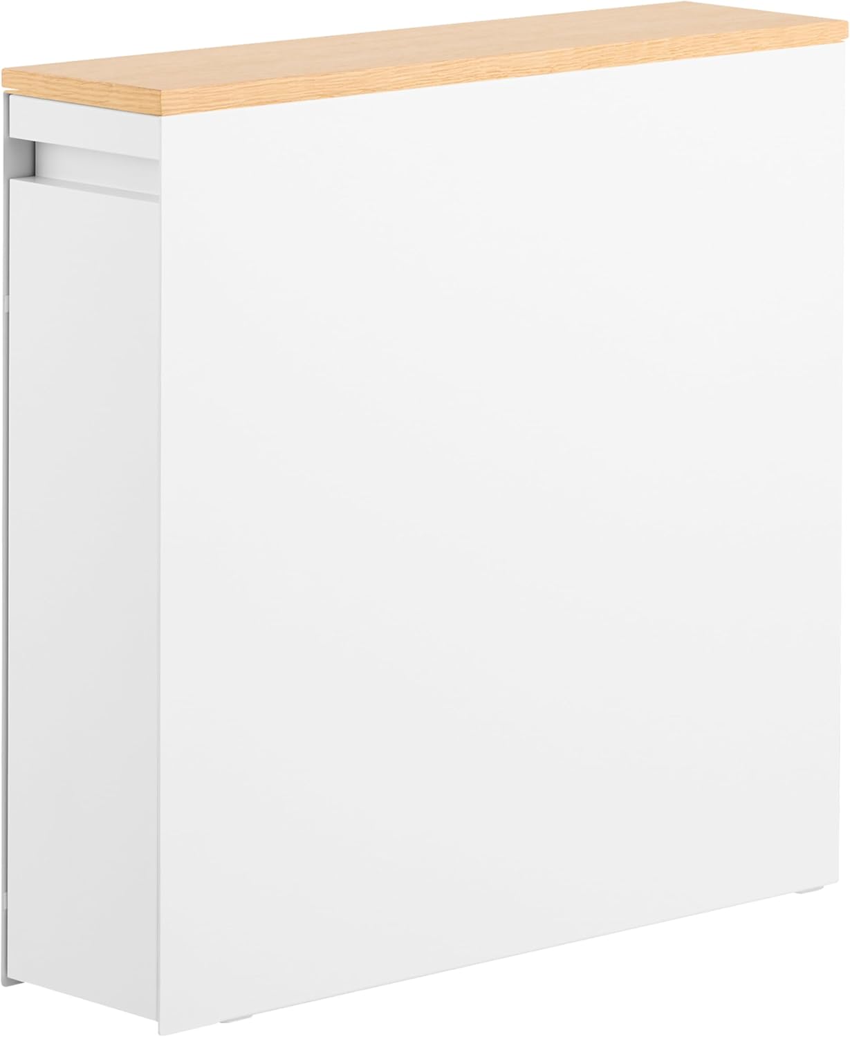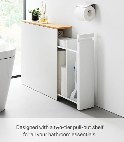 - IMPECCABLY DESIGNED, PURPOSEFULLY USEFUL – The Yamazaki Home modern, slim bathroom storage cabinet keeps essentials neatly tucked away while adding warmth and style with its natural wood tabletop.