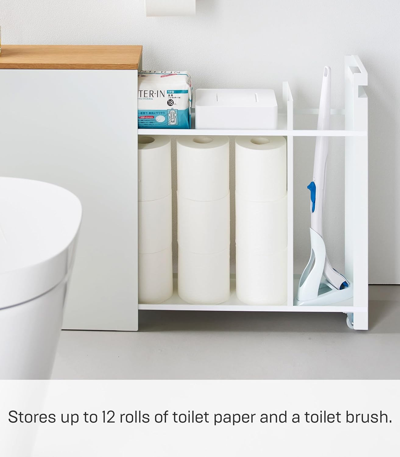- CLEVER PULL-OUT DESIGN – The two-tier pull out cabinet organizer stores up to 12 rolls of toilet paper plus a toilet brush, keeping your bathroom storage discreet yet accessible.