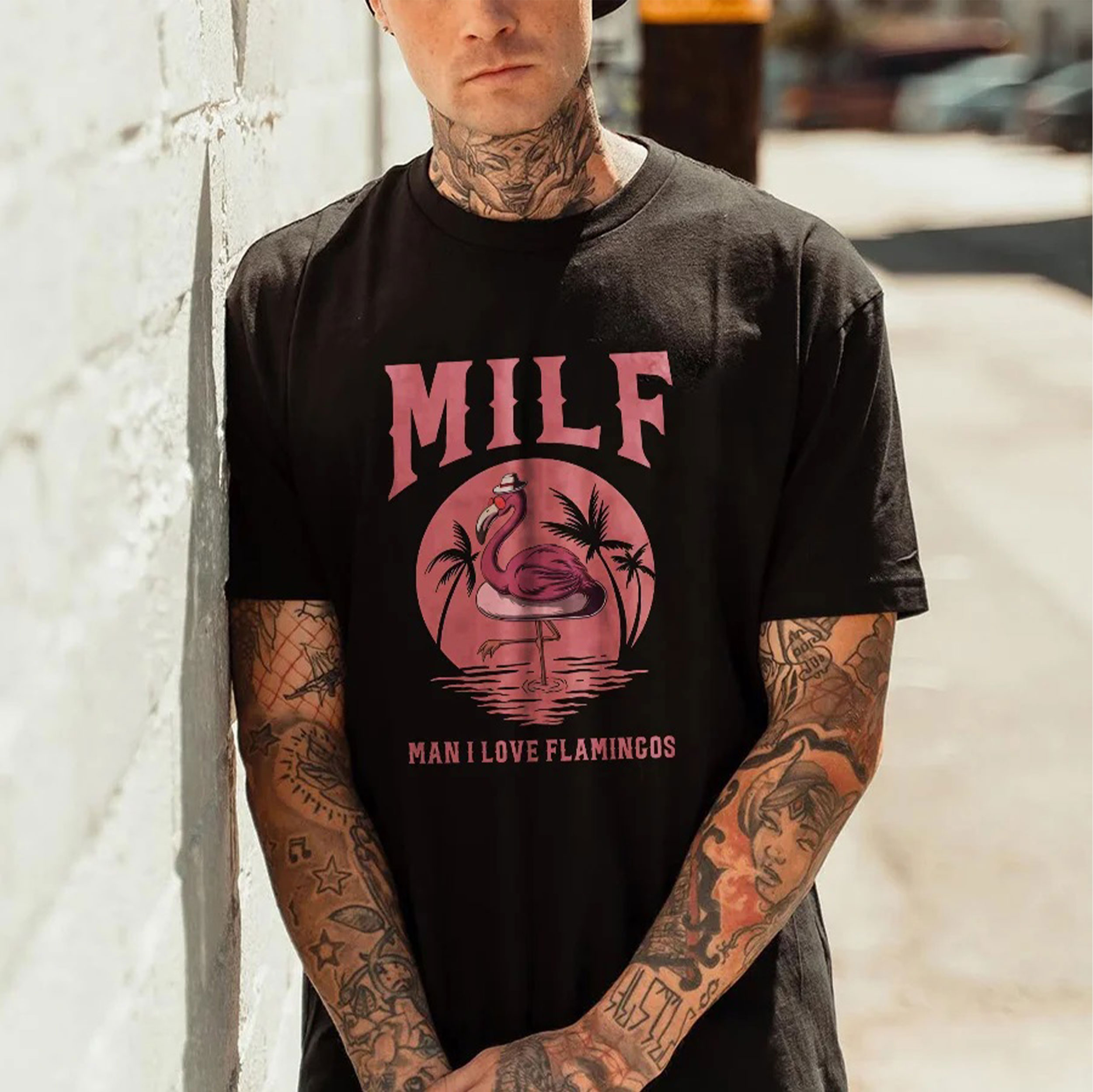 MILF MAN I LOVE FLAMINGOS Pink Pattern Black Print T-shirt