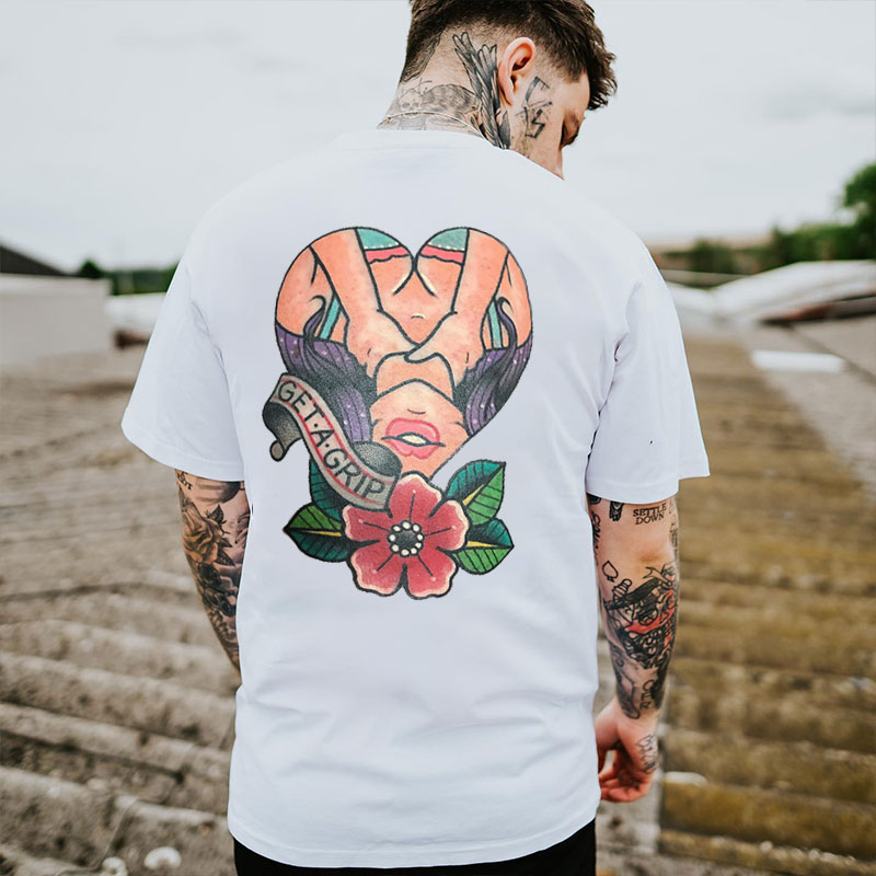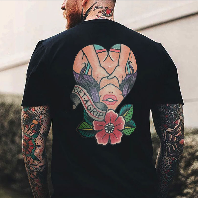 GET A GRIP Sexy Lady with Flowers Black Print T-Shirt