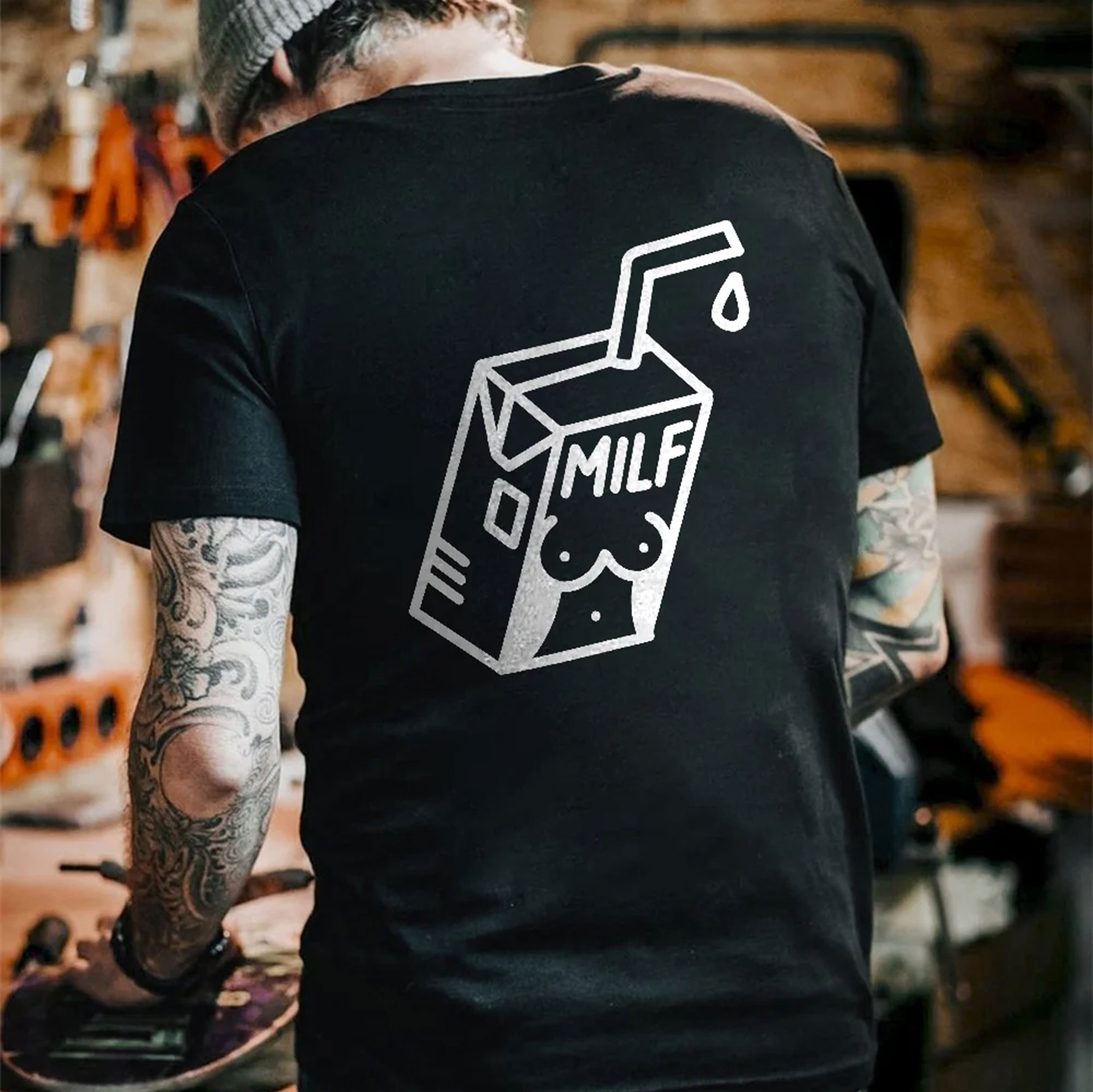 MILF Sexy Lady Outline on the Milk Box Graphic Black Print T-shirt