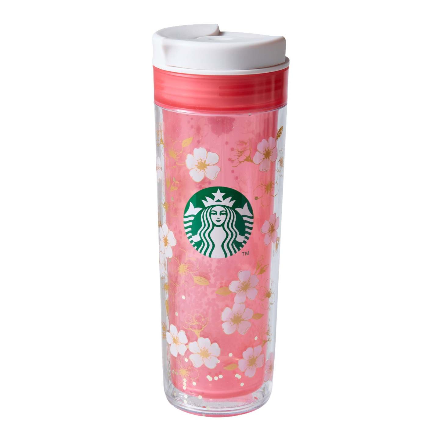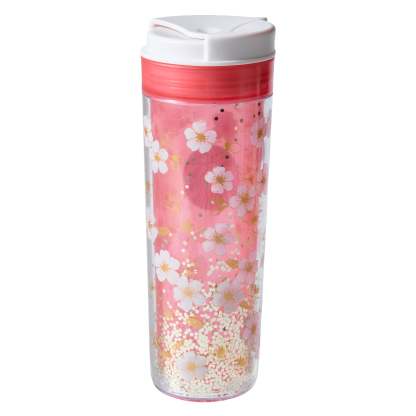 The tumbler is decorated with elegant gold foil accents, while sequins inside move gently as you sip, adding a playful yet refined touch to its seasonal sakura-inspired design.